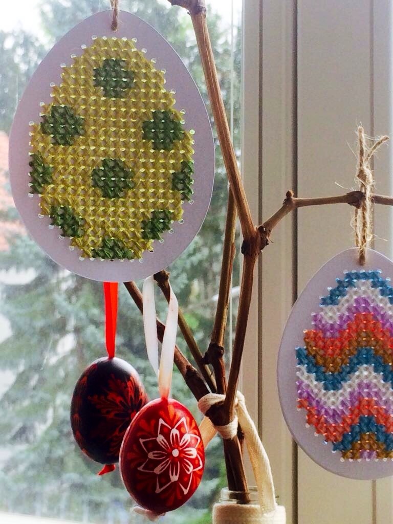 – En la tienda Wolle Rödel venden casi todo lo que puedas imaginar que tenga que ver con bordados, lanas, telas…allí encontré unas plantillas para decoración de Pascua de la marca Rico Design. En realidad no son más que unas cartulinas con forma de huevo, taladradas de forma que se pueden bordar a punto de cruz. La pega es que la perforación era tan gruesa que tuve que bordar con las 6 hebras de la madeja para que quedara bien.