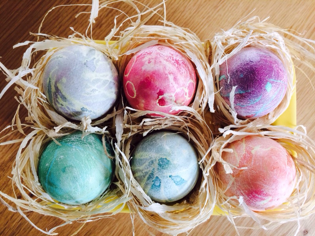 – Pintar huevos de pascua, es muy típico aquí. Así que compramos los huevos en el Butlers y la pintura en el dm. Así Jorge y Alba pasaron una mañana pintando. A Alba hubo que convencerla de que lo que había que pintar eran los huevos y no los periódicos que habíamos puesto para protege la mesa. De paso nos pintó un par de cuadros.